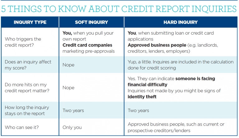 A hard inquiry, on the other hand, is triggered by the applicant when submitting a loan or credit card applications. As a result, hard inquiries will affect your credit score slightly as they are included in the calculation done. Recording the number of inquiries a consumer has on the credit report allows potential lenders to see how often a consumer has applied for new credit; this can be a precursor to someone facing credit difficulty. Too many inquiries could mean that a consumer is deeply in debt and is looking for loans or new credit cards to bail themselves out. Another reason for recording inquiries is for preventing identity theft. Hard inquiries that aren’t made by you could possibly be from a fraudster trying to open accounts in your name; therefore only individuals with a specific business purpose can check your score. Creditors, lenders, employers and landlords are some examples of approved business people. The inquiry only appears on the credit report that was checked.